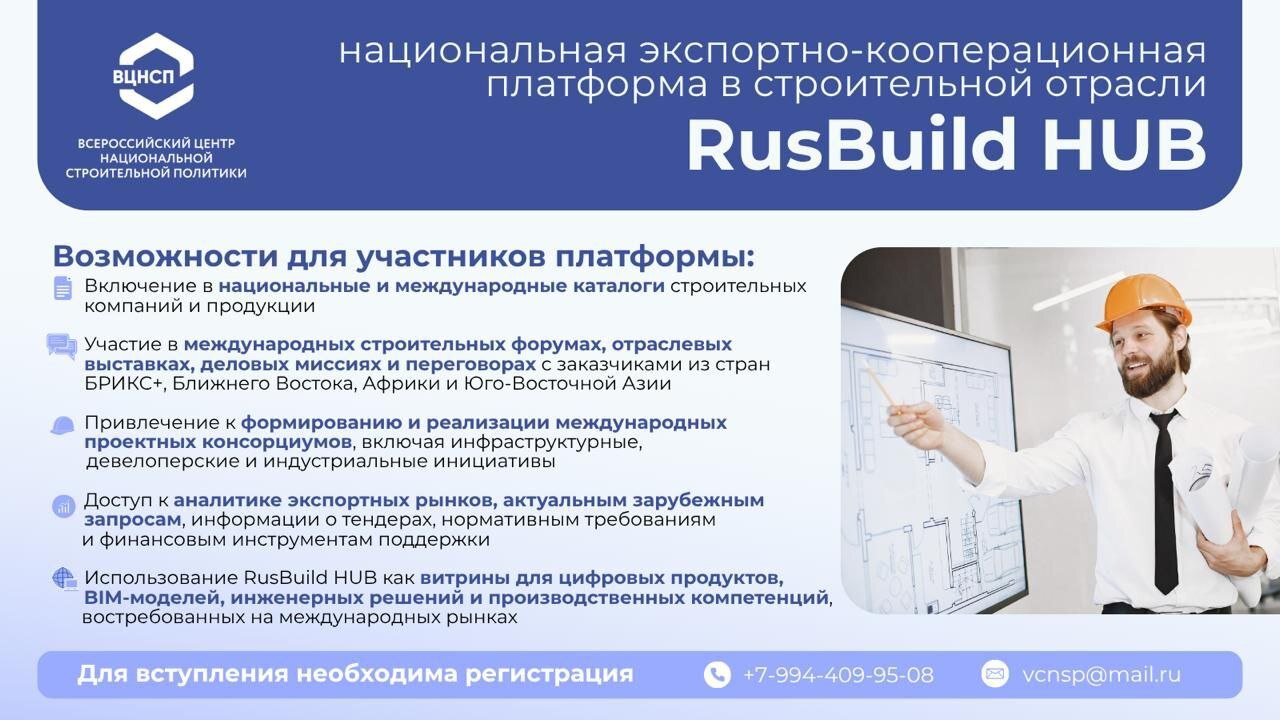 В ответ на эти вызовы Всероссийский центр национальной строительной политики (ВЦНСП) приступил к формированию реестра российских компаний строительной отрасли, который станет основой для разработки и запуска новой инфраструктуры международного взаимодействия – RusBuild HUB. Платформа будет нацелена на комплексную поддержку российских участников строительного сектора, развитие международной деловой кооперации и продвижение отечественных технологий, продукции и компетенций на глобальные рынки, включая страны БРИКС+, ШОС и другие партнерские форматы.