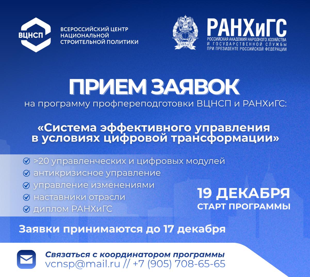 Продолжается прием заявок на участие в образовательной программе профессиональной переподготовки, которую Всероссийский центр национальной строительной политики реализует совместно с Президентской академией (РАНХиГС).